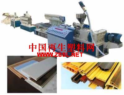PVC装饰线条及线槽、扣板挤出生产线 产品说明: 该生产线主要生产可生产各种规格的PVC扣板、贴脚线、压条等小型材。 可配锥形双螺杆挤出机,也可配单螺杆挤出机,灵活性大。 木塑共挤(发泡)异型材该机组无需造粒,物料与木粉混合后可直接挤出木塑型材。适用物料:PE、PP 木粉,PVC 木粉。可生产托盘,包装箱板,装饰板材等。生产工艺简单,我公司均可提供配方和人员培训。